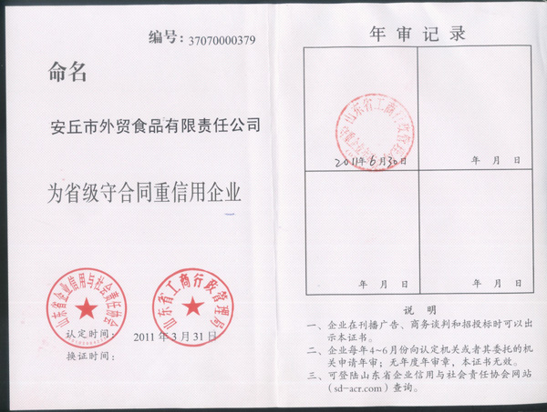 公司被山东省企业信誉评价工作委员会评为山东省AAA级信誉企业